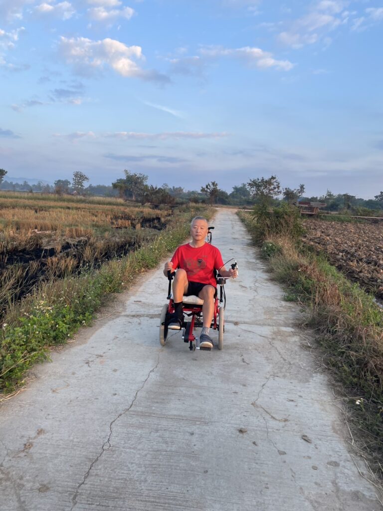 最後に、私の日々のエクササイズ様子です。乗っているのはペダルを足で漕いで進む “COGY(コーギー)” という名の “足漕ぎ車椅子” です。 片麻痺で麻痺側の腕の能力が足りず、電動車椅子でしか単独移動出来ない人や、下半身の障害で歩行が困難な人向けのリハビリの一環として、またエクササイズの手段として、加えて私の場合は純粋に移動の手段としても活躍してます。 タイの農道を毎日4~5km走ってます。歩くような速度で。この COGY についてはまた改めて発信します。
